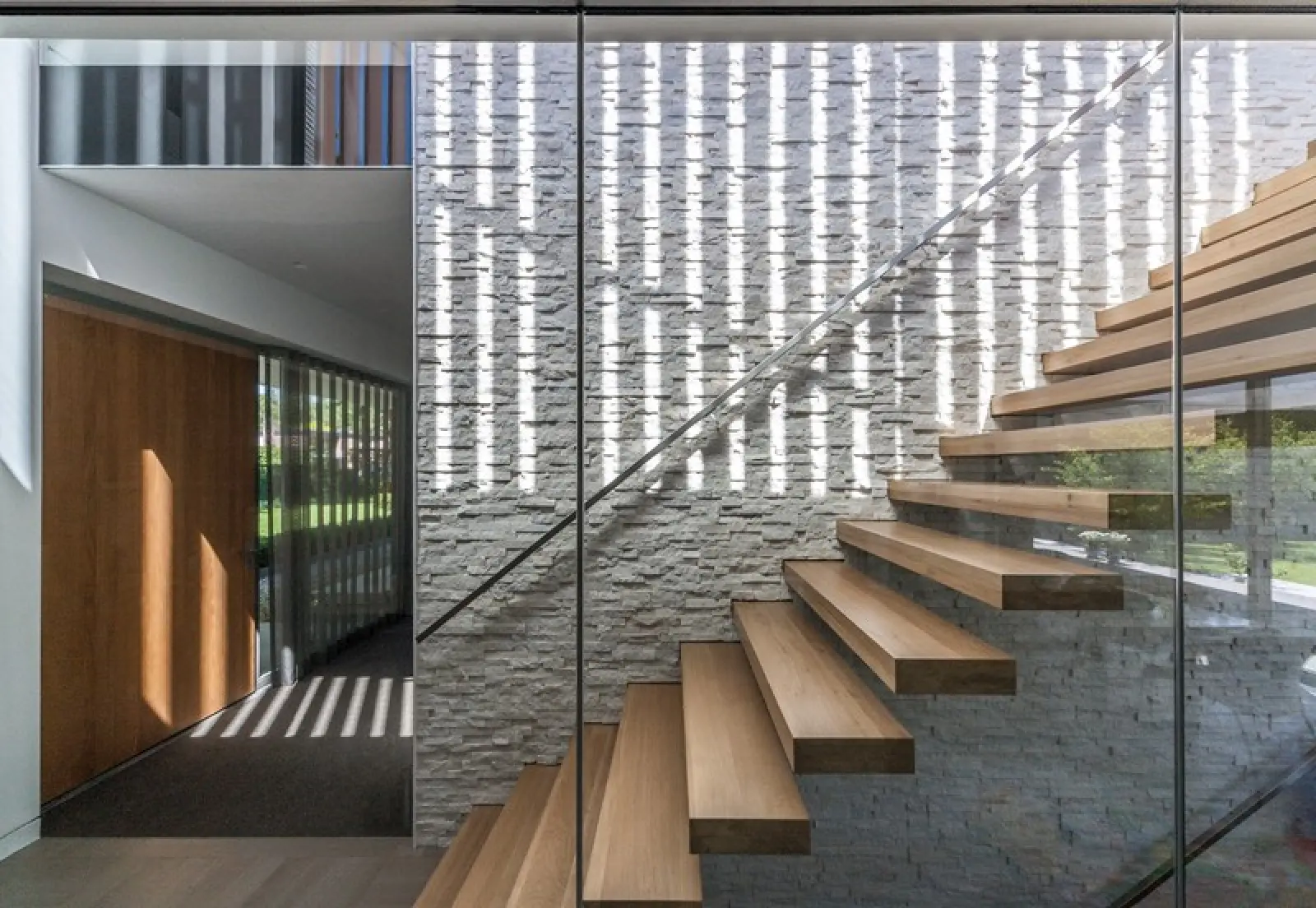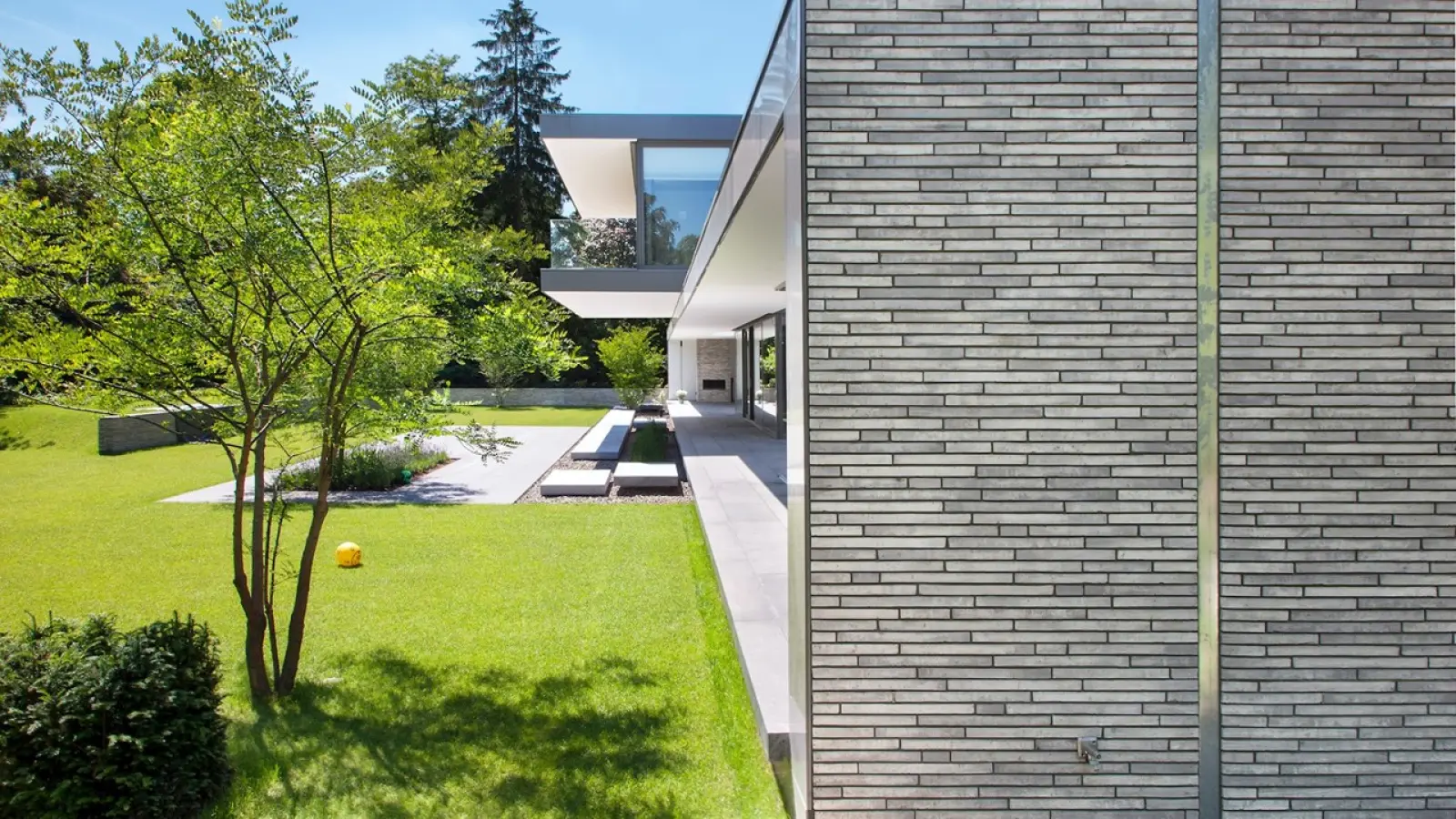 Wat materialisering betreft heeft het woonhuis een bijzondere uitstraling gekregen door de toepassing van de bijna 53 cm lange, lichtgrijze baksteen. De horizontaliteit van het woonhuis wordt door het gebruik van deze steen benadrukt. Haaks hierop zijn bij de garage, en ook op andere plaatsen aan de buitenwand van het hoofdvolume, verticale eikenhouten latten toegepast. Hierdoor ontstaat een spel van hard versus zacht materiaal en contrasterende lijnen, dat het langgerekte gebouw voorziet van een geleding en het geheel spanning en afwisseling geeft.