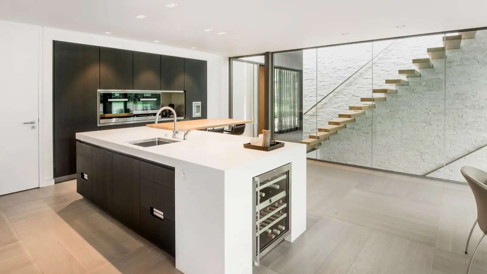 Op kelderniveau bevindt zich onder het gastenverblijf, aan de voorzijde van het woonhuis, een fitnessruimte met sauna. Deze ruimte wordt van daglicht voorzien via een groot raam dat in de zijwand van het zwembad is aangebracht. Via het daklicht in het dak van het zwembad valt er zonlicht in het zwembad, dat via het zijraam van het bad ook in de aangrenzende fitnessruimte schijnt. Dit geeft een bijzondere sfeer en lichtinval. In de avonduren wordt sfeer gecreëerd met gekleurde led-verlichting. Op kelderniveau, onder de woonkamer, bevinden zich verder nog een techniekruimte, een opslag en een wijnkelder.